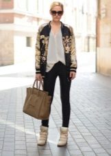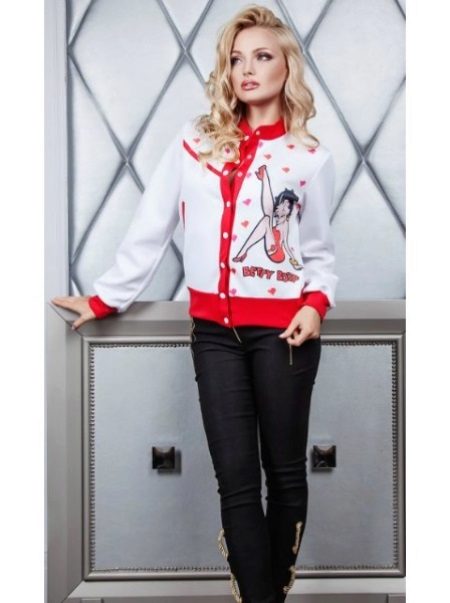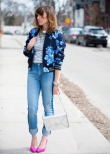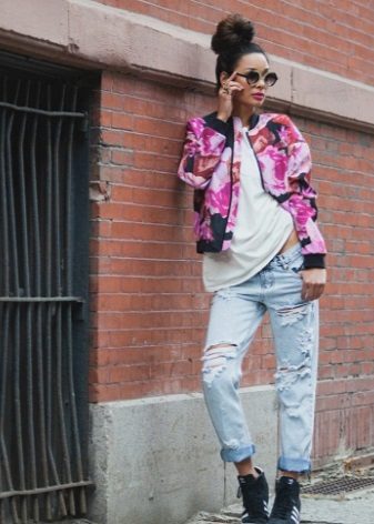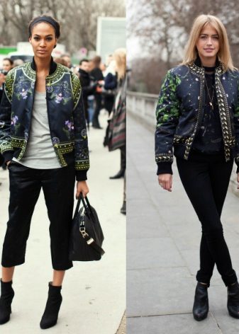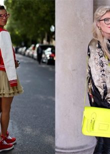 - A separate conversation - a fabric bomber with printsthat can be so diverse that in a matter of minutes they will be able to completely transform the image from a bully to a glamorous one. A checked bomber jacket with leather sleeves combined with leather trousers, a worn-out shirt and boots - really, great? A fabric bomber jacket with a paisley pattern, satin pipe trousers, a chiffon blouse and high heel shoes - is it romantic? A pink Hello Kitty print bomber jacket with pink capri pants, a white top, and white slip-on sneakers is a girly, cute look. A dark bomber jacket with a large white floral print, a knee-length pencil skirt, a white blouse with a stand-up collar, platform shoes are an office option.