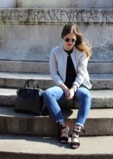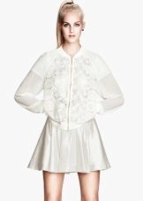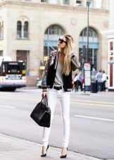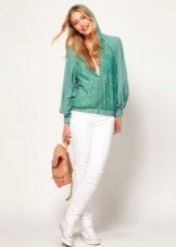 - White bomber jacket - One of the most stylish options that will suit almost everything. You can choose contrasting combinations of things, for example, white bomber and sneakers, jeans and a black T-shirt. And you can stay on an elegant bow - a white bomber jacket, gray trousers, a beige blouse and the same shoes.