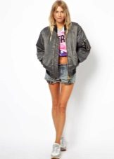 - The bomber is gray. A classic casual look is a gray and white sports bomber jacket, jeans, a white T-shirt and sneakers.