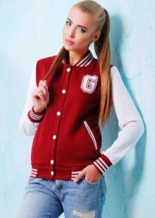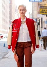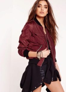- Red - bright and self-contained, bomber jacket this color can become both the main accent of the whole bow, if other things will be a background for him (for example, a skirt, a high-neck sweater and platform shoes in black), and one of the components (red bomber jacket with white sleeves, dark red jeans, a white T-shirt and sneakers of the same color).