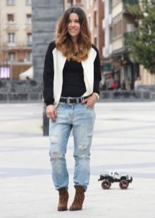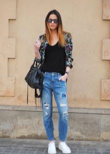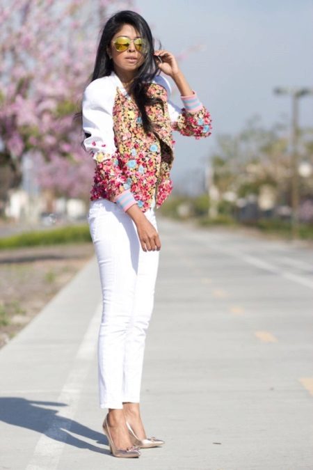 - A beautiful bow - white skinny jeans, a gray top, golden stilettos and a bomber jacket embroidered with small flowers.