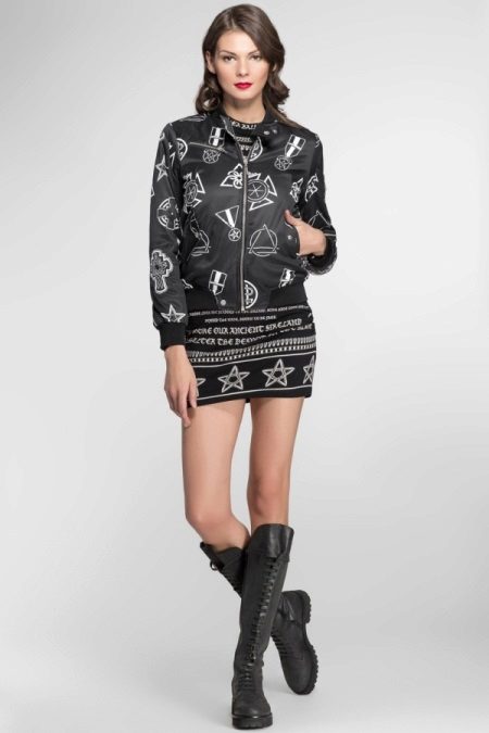 - An unusual image, consisting of a black satin bomber jacket with a white geometric print, a short dress made of the same fabric and high rough lace-up boots.