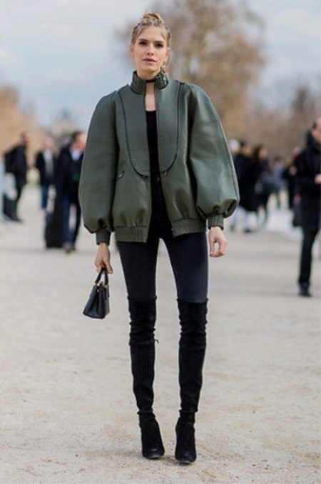 - An extended khaki leather bomber jacket with an unusual cut sleeve and a stitching that imitates a shawl collar with ordinary jeans, a black top and over the knee boots.
