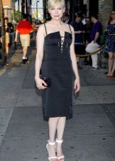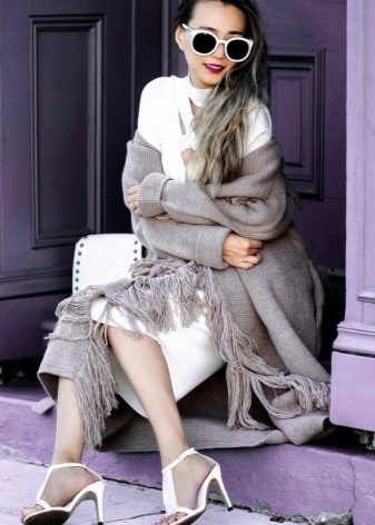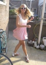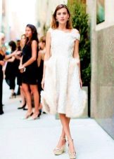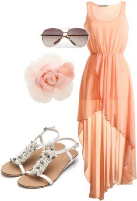 - White sandals will become a beautiful and fashionable addition to the image in pastel colors: delicate peach, cornflower blue and caramel pink colors are in perfect harmony with white.
