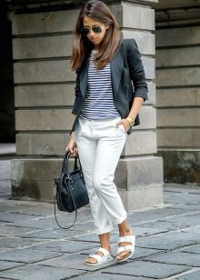 Stylists and designers are of the opinion that it is not worth choosing shoes for a bag. If you want to combine a light bag and white sandals, pay attention that they are from different collections and do not repeat exactly the lines and decor of each other. Complete with white sandals, a black and white bag or a bag with a print will look great, as well as a bag of bright summer tones and even a leather backpack.