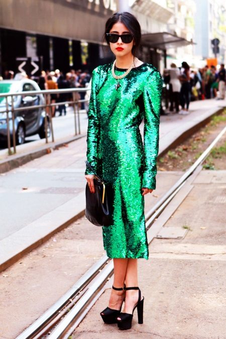 And to beautifully shade the outfit of a deep, deep color (yellow, emerald, blue, red, etc.), sandals can also, in addition to black, have elements of the same color as the clothes.