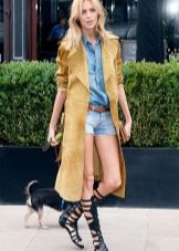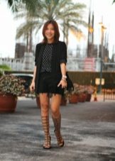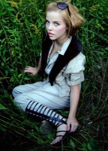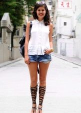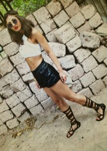 For ladies who prefer casual style, the best solution would be a loose shirt or an alcoholic T-shirt in combination with denim shorts or a miniskirt. Since “gladiators” on a flat sole are ideal shoes for long walks, it is not forbidden to add a bit of sports to the image, wearing a fierce T-shirt or leggings with them. The latter, of course, are permissible only if sandals are below the ankle.