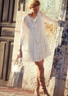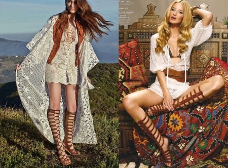 Sandals in the Roman style are very supportive of similar accessories. It can be leather bracelets, belts or bags with studs, fringe or decorated with weaving. Voluminous earrings and an ethnic style necklace made of leather, beads and metal will look great.