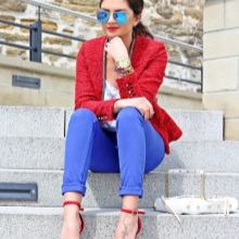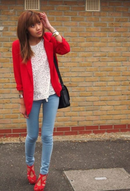 A good example of a casual look with red sandals. Light blue trousers are in harmony with a delicate lace blouse. A red jacket of the same color with shoes creates a wonderful tandem, and a neat black bag completes the image.
