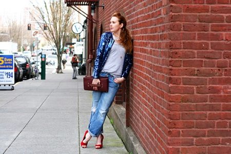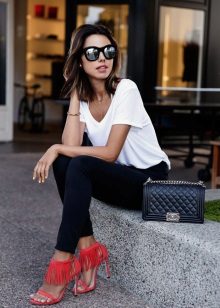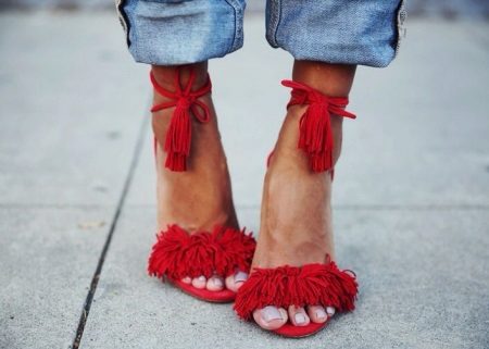 Jeans are another universal option for red sandals. Wearing them with shoes on the platform, you will look very fresh and positive.