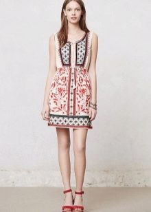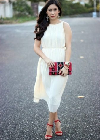 A feminine summer dress made of airy materials, made in a delicate pastel color, will harmoniously look with red sandals with medium heels.As an option, you can choose a shoe model decorated with an interesting decor, for example, a neat flower to match the main color or a contrasting bow.