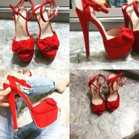 Red platform sandals will help to brighten any look. By the way, the big plus is that models on the platform can be worn by teenage girls. Since their leg has not yet fully formed, putting on heels, there is a risk of flat feet or other health problems. Choosing platform sandals, young girls can safely wear high shoes without worrying about the consequences.