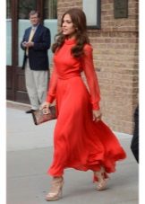 Scarlet heeled sandals will make the restrained outfit of a business woman more vibrant and exciting. As suitable accessories, you can choose an elegant strap or a bright bracelet to match the shoes.