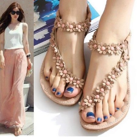 Flat sandals are an ideal option not only for every day. Richly decorated models can become part of the evening look. For example, in combination with a long, flowing dress in the Greek style.