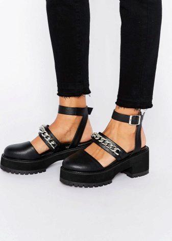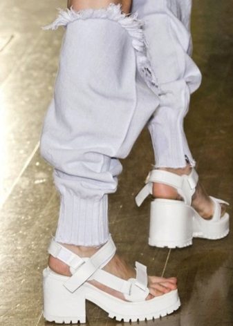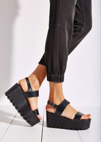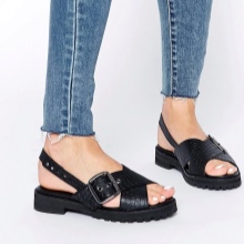Thick low-soled shoes. A continuous tractor platform of about the same level from the toe to the heel of the sandals gives the shoe massiveness. When purchasing this model of summer sandals, carefully think about what you will wear them with.