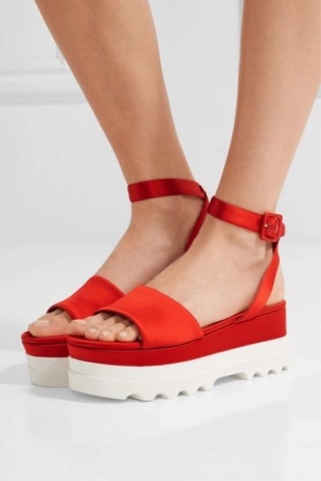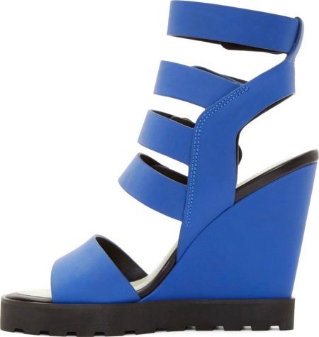 - bright colors are always appropriate in summer looks. Do not get involved in excessive color mixing. So, for example, with a white sole all colors of the rainbow will look good, but not at the same time. A great choice is the black platform. It is less easily soiled and visually lengthens the legs. With black, all shades are also good. Very rarely, but still, there are models with a color platform. The wedge heel in this case can be covered with net or fabric.