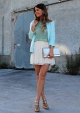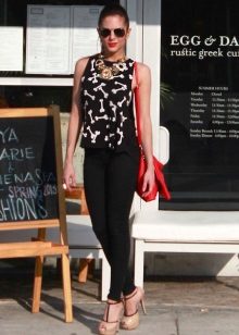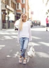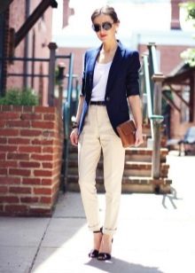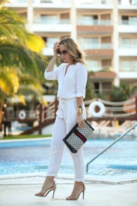- To create a summer relaxed look for an evening cocktail or meeting with friends, choose clothes in bright colors. White cotton trousers, a light blouse and suede sandals of beige color on a thin stiletto heel. The image will complement sunglasses, exquisite jewelry and a stylish clutch.