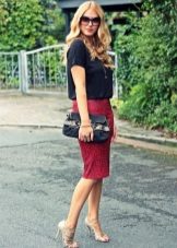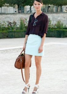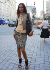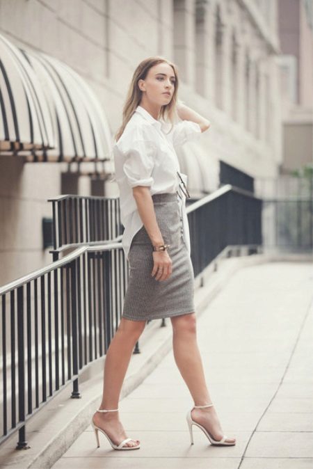 - A gray pencil skirt, a white shirt with rolled up sleeves, carelessly tucked in, and white sandals with a thin strap are suitable for a fashionable business look. Look will complement a watch and a comfortable bag. Get a stylish and concise image for working in the office.