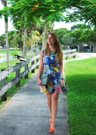 - For a party, a bright tight-fitting coral-colored dress that can be complemented with turquoise heeled sandals. The finishing touch of the image will be a massive necklace not a small golden clutch in which you can put everything you need.