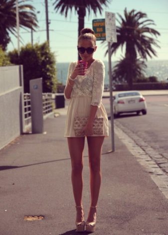 Of course, a feminine dress is best suited to such sandals. For an evening out, a gorgeous dress on the floor is suitable. A short dress would be appropriate at a cocktail party. For a romantic date, a fluffy airy dress with a tutu skirt is suitable. Also, stiletto sandals will look good with an evening suit or romper. To emphasize the solemnity of your bow, give preference to exquisite materials: velvet, silk, lace, sequins and beads.