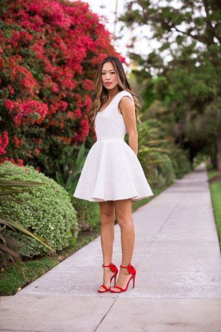 - For a romantic date, a fluffy white dress to the middle of the thigh is the best fit. Elegant stiletto sandals in bright red color complement the look. Your chosen one will not be able to look away!
