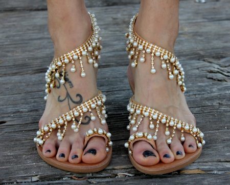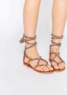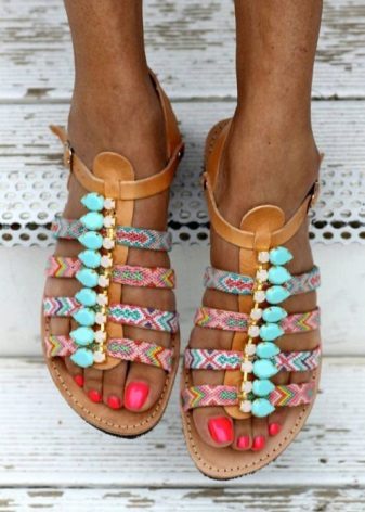 The principles of decoration of low-heeled sandals are not much different from the decor of the rest of summer shoes. Fringes, tassels, ribbons, rhinestones, stones and all that are enough for the imagination of designers act as decorative elements.