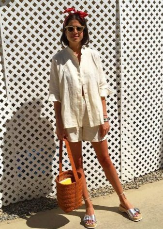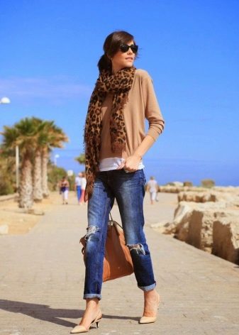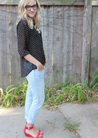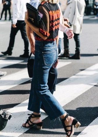 Or blue jeans of a classic cut with closed sandals during the day and woven or decorated in the evening.