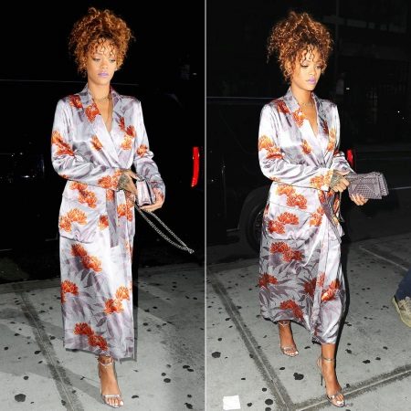 A silk kimono dress with gold sandals looks very elegant and stylish.