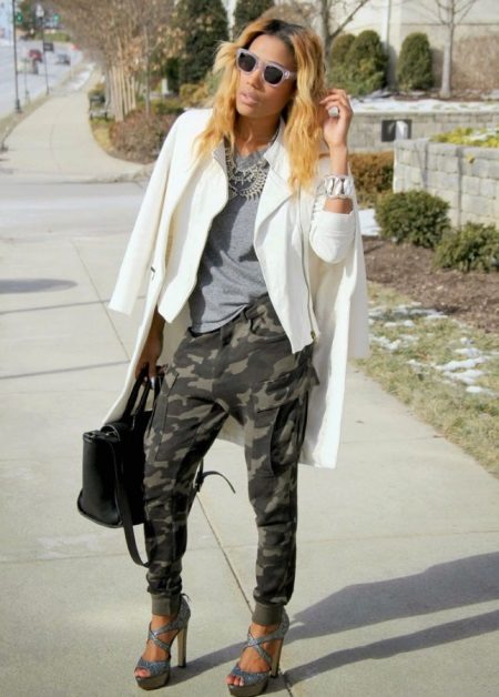 A gray T-shirt, a white coat, military-style joggers and sparkling stiletto sandals. The image is complemented by a massive necklace and baslet, sunglasses, a large black bag and nude lipstick.
