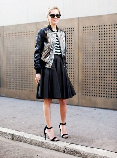 Going out on a cool summer evening? Surprise your chosen one in an unusual way. A fluffy black skirt, a striped top, black stiletto sandals and a metallic bomber jacket. Complement your look with sunglasses and stylish jewelry.