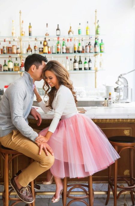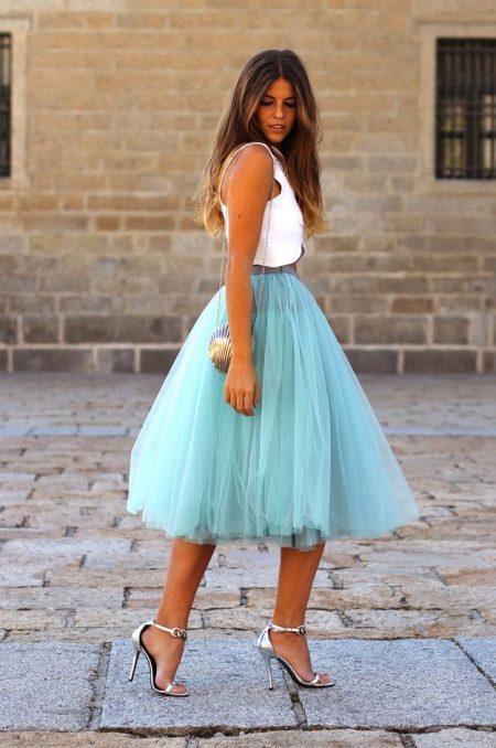 The image in pastel colors looks very romantic. For example, a turquoise tutu skirt in combination with belfm chrome then, and all this should be complemented with gold sandals and a matching clutch bag.