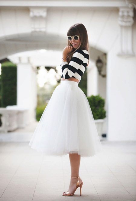 An image with a tutu skirt made in monochrome style looks no less elegant. So, a white skirt and a blouse with black and white stripes are ideally combined. Everything can be supplemented with unusual glasses and gold sandals. And you definitely will not be left without attention!