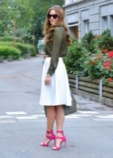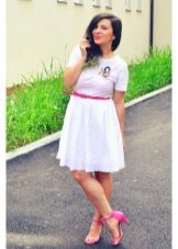 Wonderful casual look for a young girl. A light snow-white dress of a feminine silhouette, flared from the waist, perfectly complements a short denim jacket with casually tucked up sleeves. Bright pink sandals on a flat sole are very appropriate for this ensemble (note that their shade exactly matches nail polish) - they are its bright dominant. This youthful image is completed by a spectacular accessory - a leopard-colored handbag.