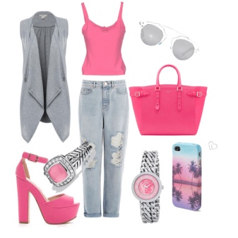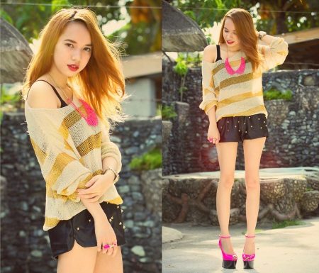 Another catchy youth ensemble. Sandals on a stable heel of a saturated fuchsia color correspond to the shade of lipstick and have something in common with a blouse of a lighter tone. The basis of the outfit is a white blouse and pale blue narrow striped shorts.Massive multi-colored jewelry gives an interesting look to the image.