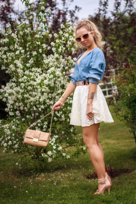 A flared layered mini skirt with a guipure top looks extremely feminine. A noble gold-colored metal belt accentuates the waist and matches the texture of a wide openwork bracelet. The denim shirt is seductive due to the deep neckline that opens the chest. Perfectly complement this image of high-heeled sandals in a delicate powdery shade. Shoes look original thanks to the closed heel with clasps and the interweaving of many ankle straps. A small handbag on a chain matches the color of sandals. The girl’s hairstyle - deliberately carelessly picked up locks of hair - and sunglasses of an unusual design complete this glamorous image.