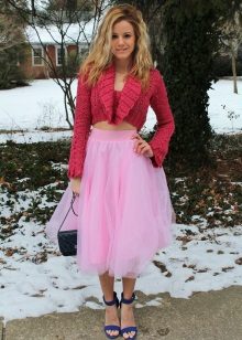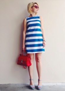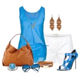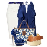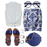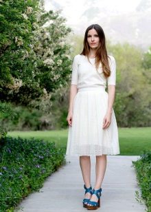 This summer ensemble is built on a combination of blue and white. It is always a win-win combination. A cropped white skirt of a slightly flared style is complemented by a blue flowing fabric top. The highlight of the image is leather blue sandals with an intricate weave of wide and narrow straps that rises above the ankles. Sandals are devoid of heels, however, without it they look very interesting. The image is successfully complemented by accessories - a massive metal bracelet and a small handbag on a narrow strap in dark red.