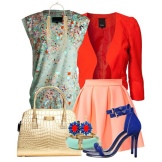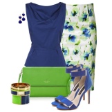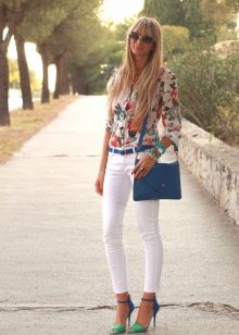 Stylish and elegant casual look. The modest style of the snow-white blouse is compensated by the bright floral ornament of the skirt, which also has a strict cut and a rather chaste length. An extravagant note in this ensemble is made by bright blue sandals on a high platform with a large steady heel. Open noses show impeccable pedicures, and straps with golden buckles emphasize the grace of the ankle.Another refreshing element of this ensemble is a bright yellow handbag, the color of which echoes the print of the skirt. Bracelets and watches in gold tones successfully fit into this ensemble.