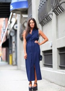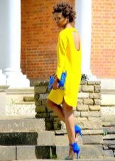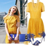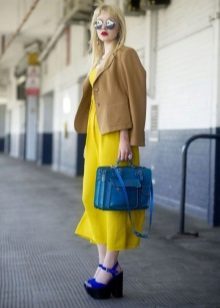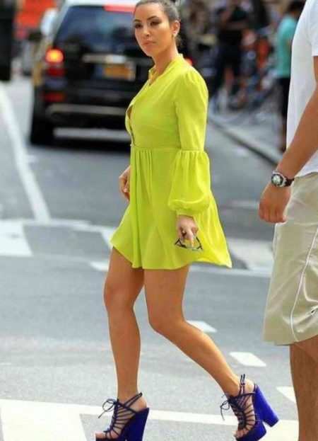 An extravagant and bold look: a bright yellow mini dress is combined with dark blue sandals of an original design. The dress has a high waist line, due to which a flying silhouette is formed. The short length shows slender legs. Original long sleeves flared below the elbow. The front closure piquantly opens the chest. Shoes in this tandem are no less worthy of attention. The high platform looks spectacular, flowing smoothly into a stable heel. The original design solution is the numerous interweaving of thin straps with imitation of lacing.