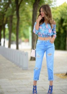 If we look at specific wardrobe items, then blue denim shorts always successfully combine short jeans, which, incidentally, emphasize the beauty of your legs like nothing else. In this case, choose shoes without unnecessary decor, for example, a varnish model on the platform.