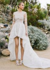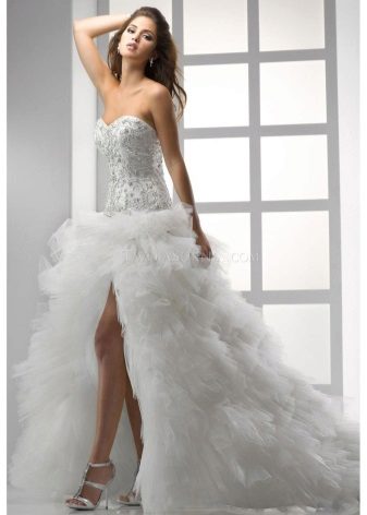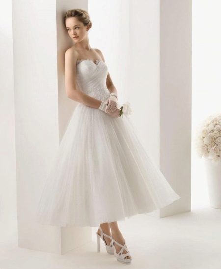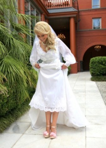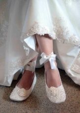 Shoes on a small wedge and with a closed heel will not look massive on tall girls. Such sandals in combination with a skirt of medium splendor are the best fit slender and tall brides.