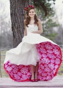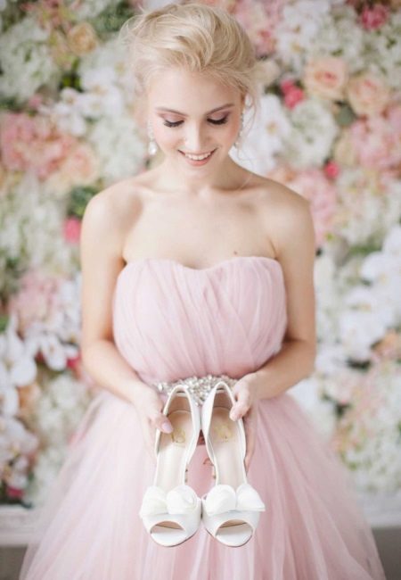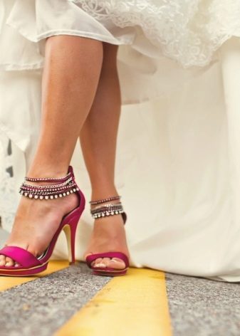 And yet, with a long wedding dress, it is better to turn to a proven classic. Cream, pale blue and pink tones will create a unique ensemble. But wearing a short white dress, you can experiment with shoes, because it will immediately attract the attention of others. A worthy option will be red, blue, silver sandals. With colored dresses, try to ensure that the color of the sandals is identical to the outfit.