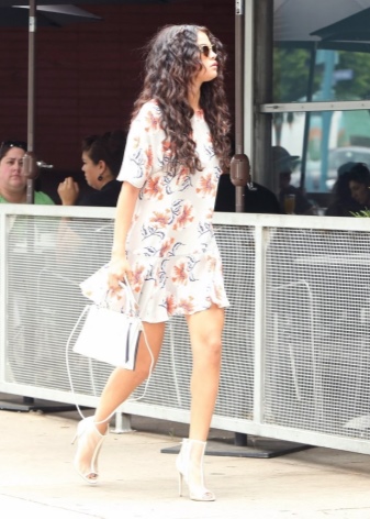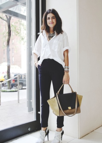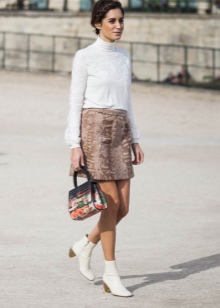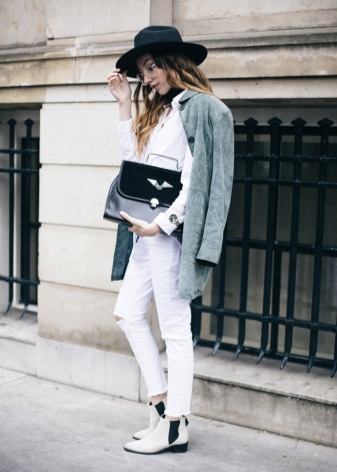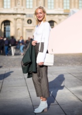 Snow-white shoes will look great with a white outfit. So that the kit does not look ridiculous or strange, it is necessary to dilute it with bright accessories of various colors. White clothing, decorated with contrasting or delicate prints, will perfectly harmonize with ankle boots.