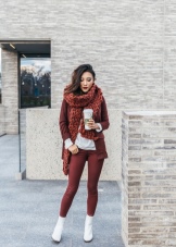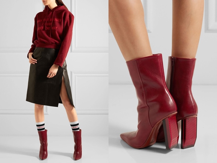 Spectacular brunettes can choose the outfit of scarlet or fiery red. A combination of a black slit leather skirt, a red blouse with and sexy thick heeled ankle boots will look stylish.