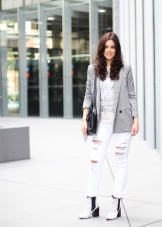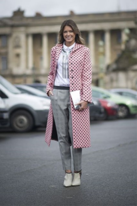Skinny gray trousers, a long-sleeve blouse and a light pink coat will look harmonious. You can complement the look with white heeled shoes and matching handbags.