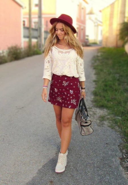 Girls who do not suit the bright red color can choose an outfit of raspberry, carrot and coral. The skirt with a light lace blouse and summer white lace-up shoes will look original. Bag perfectly complement this outfit.