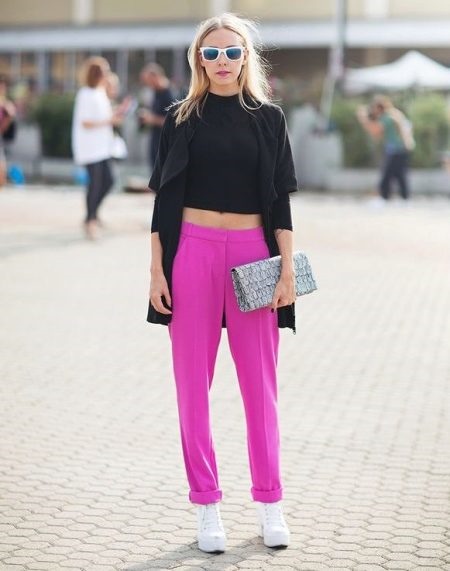 White color magically emphasizes the tenderness and femininity of a pink hue. A pink outfit and white shoes will be a great combination for the hottest summer season. You can complement this set with accessories or outerwear in gray, cream and beige.