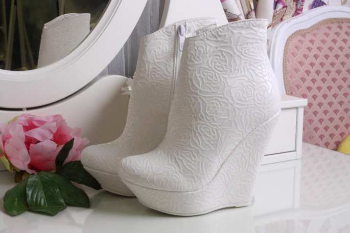 If the wedding is planned in the cold season, snow-white ankle boots will be very handy. These shoes will create a unique and fabulous look for a stylish bride. With such models, short wedding dresses look harmonious.
