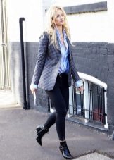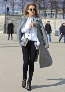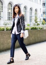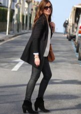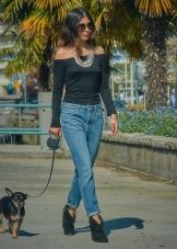 The wide heel looks good with jeans. As a top, such an ensemble will be successfully complemented by a T-shirt or blouse with modern decor. A more rigorous option involves a combination with a black blazer of a classic cut.