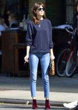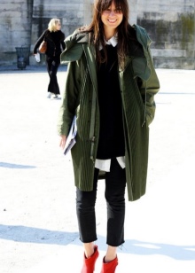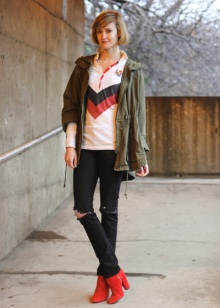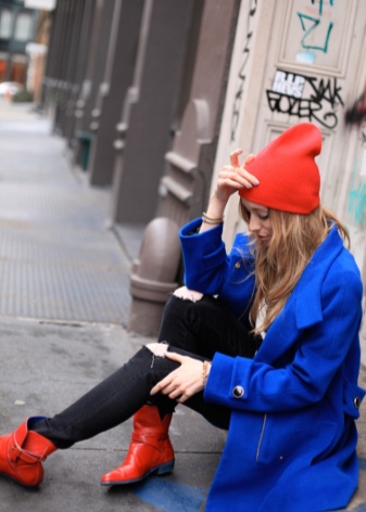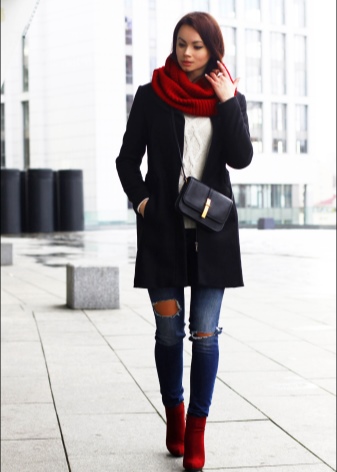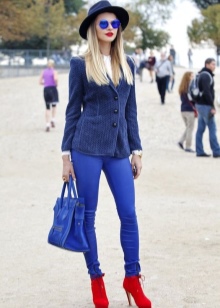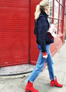 An unexpected combination of blue and red can only afford a very bold fashionista, who is not afraid to attract the attention of others. It is recommended to choose things of a simple cut to avoid an absurd and defiant image. Scarlet ankle boots look harmonious with classic and skinny jeans and denim skirts. Upstairs you can wear a mint or white jacket or blouse and a blue jacket. You can complement the image with a scarlet belt and clutch.