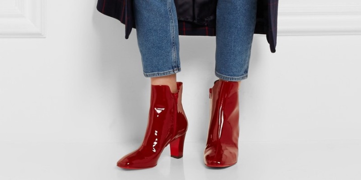 Red patent leather ankle boots look very sexy and cocky. Particularly attractive and feminine look products with high heels and platforms. A contrasting combination of a black or white sole and a shiny red top will surely attract attention. With such shoes, you should not combine things in a similar red color. A plain dark or light outfit will look harmonious.